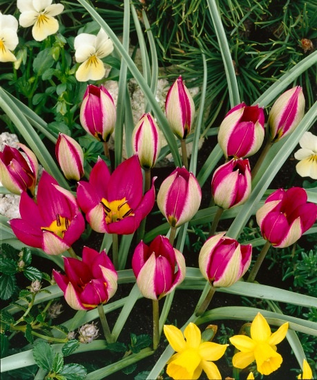 Jedinečná kombinácia purpurovočervených okvetných lupienkov s výrazným žltým stredom. Rozmnožuje sa tak rýchlo ako iné divé tulipány. Obzvlášť dobre vynikne v kombinácii s nízkymi narcismi. Výška 8 cm.
