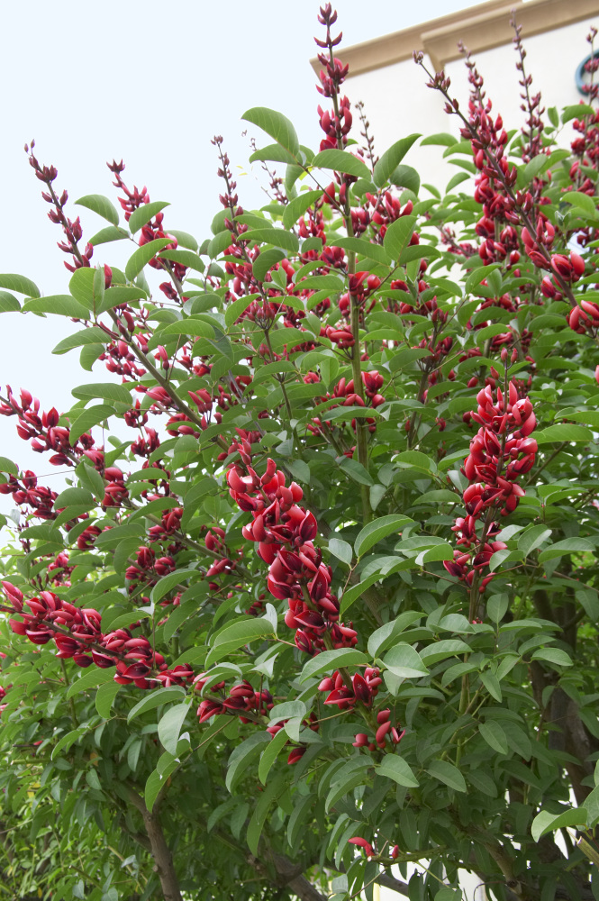 Korálová ker - ker alebo menší stromček, kvety temne šarlátovo červené v strapcoch, mrazuvzdorná do -10 ° C pri pestovaní vo voľnej pôde, národný kvet Argentíny.