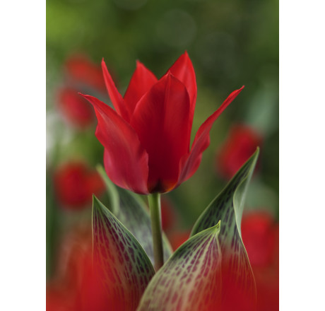 Žiarivo červený tulipán s veľmi príjemným názvom vynikne najlepšie, keď je vysadený v skupinkách na pozadí nižších skalkových rastlín. K atraktivite prispieva aj fialová kresba na listoch. Výška 20 cm.